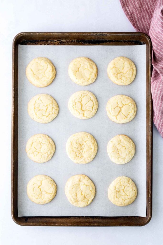 Scoop the dough into balls and roll in the remaining 1/2 cup granulated sugar. Place on the baking sheet, leaving 2 inches of space between each. I recommend baking one sheet at a time for better air flow.