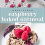 Raspberry baked oatmeal features almonds and cacao nibs and is a filling, make-ahead meal.